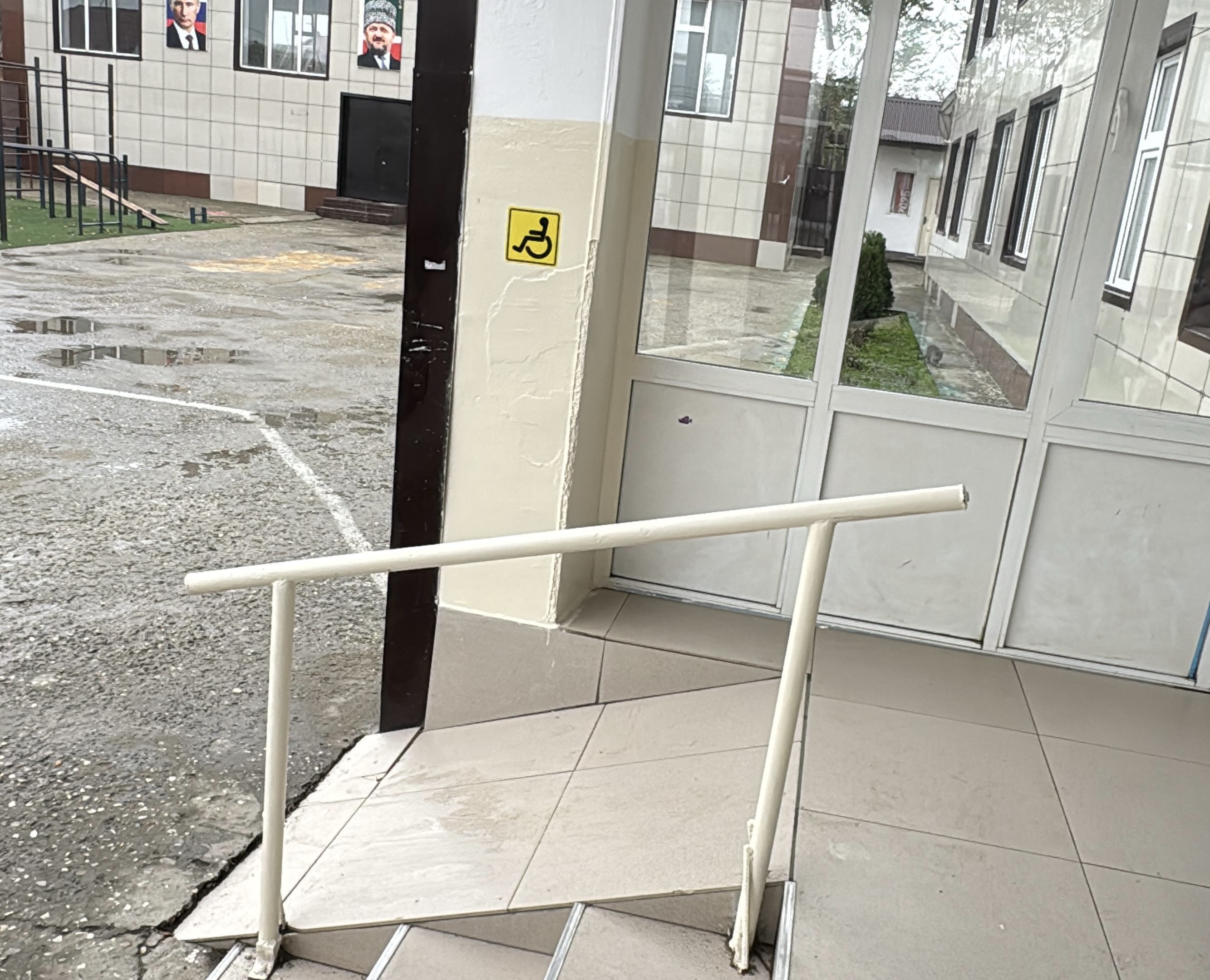 • Пандус для инвалидов и лиц с ОВЗ оборудован на ступенях при подъеме на первый этаж здания.